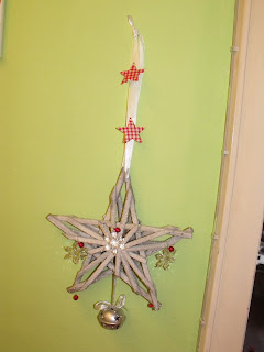 Daran befestigt werden noch Schneeflocken aus Acryl, sowie kleine rote Glöckchen und Zimt-Röllchen. Unten drunter wird eine grössere Glocke in gold oder silber hängen, ich habe mich noch nicht entschieden, das kommt beim Basteln, aber ich habe beide da. ;)